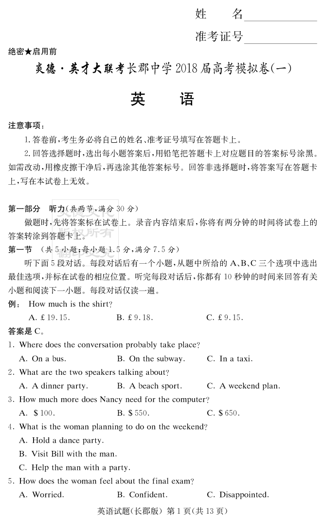 【英語】炎德英才大聯考2018長郡中學高三9次月考(模擬一)