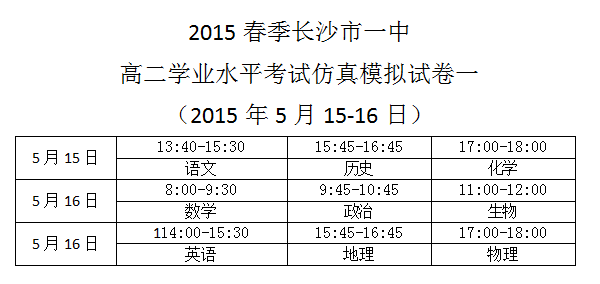 2015春季長沙市一中高二學業水平考試仿真模擬試卷一考試時間安排(2015年5月15-16日)