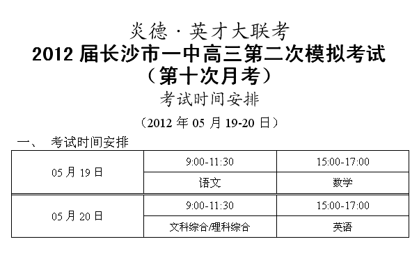 炎德英才大聯考長沙市一中2012屆高三第二次模擬(第十次月考)考試時間和范圍
