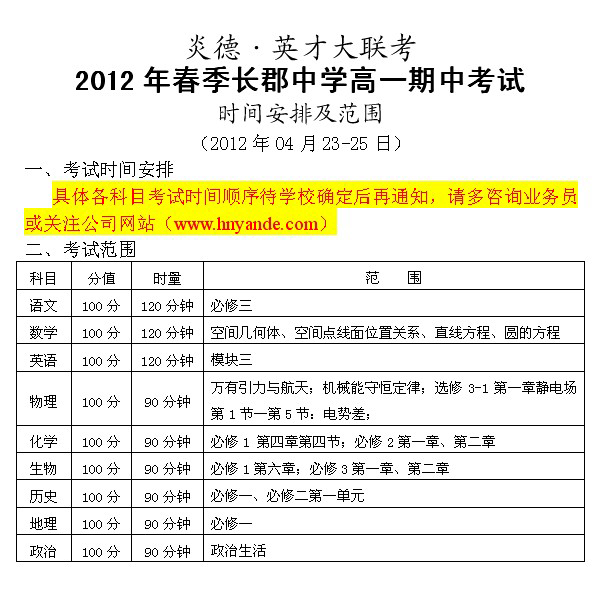 2012春季長郡中學高一期中考試時間及范圍