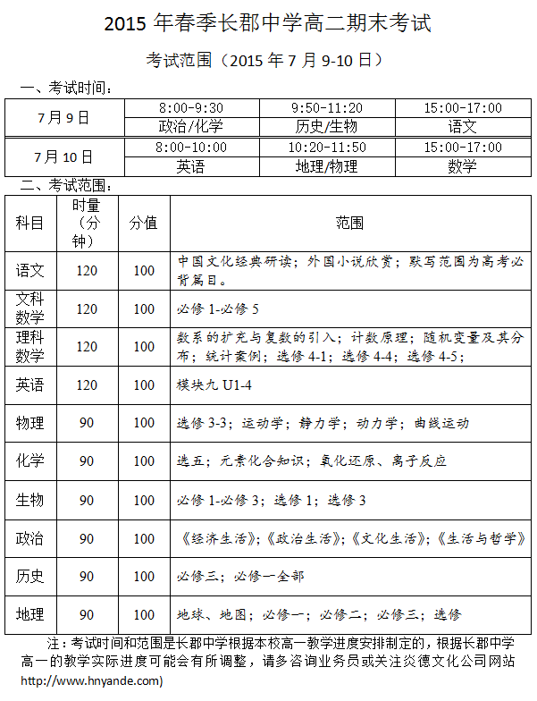 2015年春季長郡中學高二期末考試考試范圍(2015年7月8-10日)