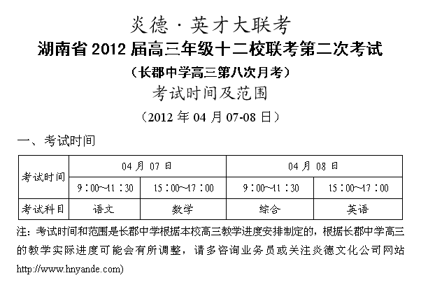 炎德英才大聯(lián)考長郡中學(xué)2012屆高三第八次月考(十二校聯(lián)考二考)時間和范圍