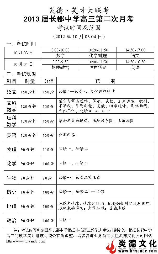炎德英才大聯(lián)考長(zhǎng)郡中學(xué)2013屆高三第二次月考考試時(shí)間和范圍