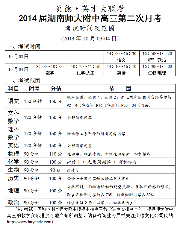 炎德英才大聯(lián)考師大附中2014屆高三第2次月考考試時(shí)間和范圍(2013.10.03-04)