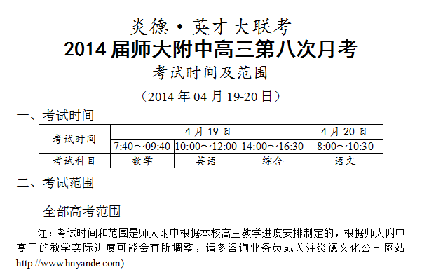 下一篇:炎德英才大聯(lián)考師大附中2014屆高三第二次模擬(第9次月考)考試時間和范圍(2014.05.0