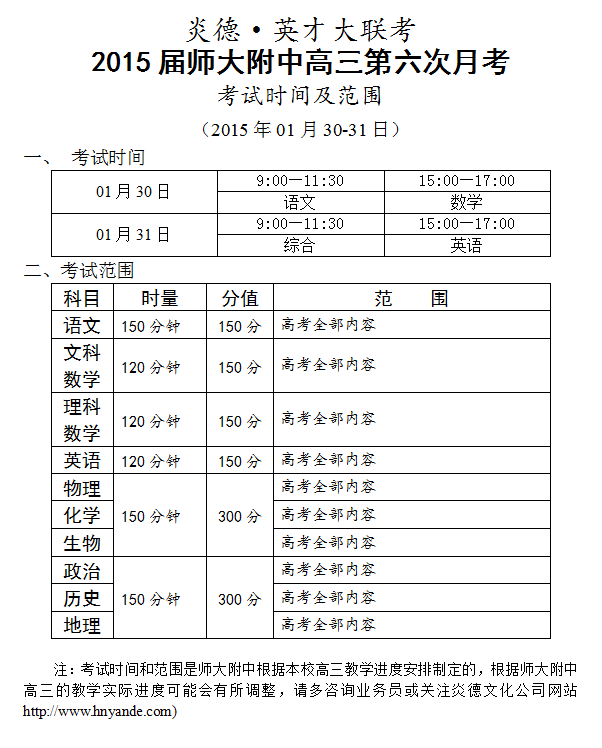 炎德英才大聯(lián)考師大附中2015屆高三第6次月考考試時(shí)間和范圍(2015.01.30-31)