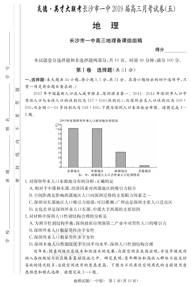 【地理】炎德英才大聯考2019長沙一中高三5次月考