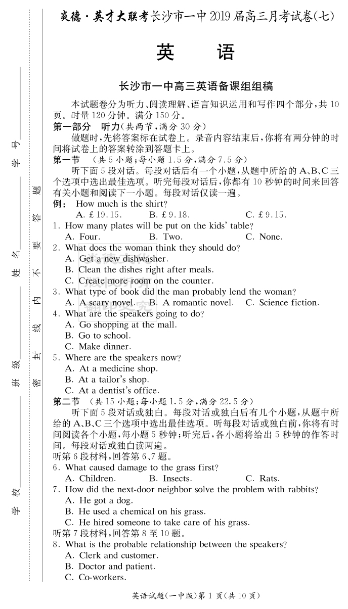 【英語】炎德英才大聯(lián)考2019長沙一中高三7次月考