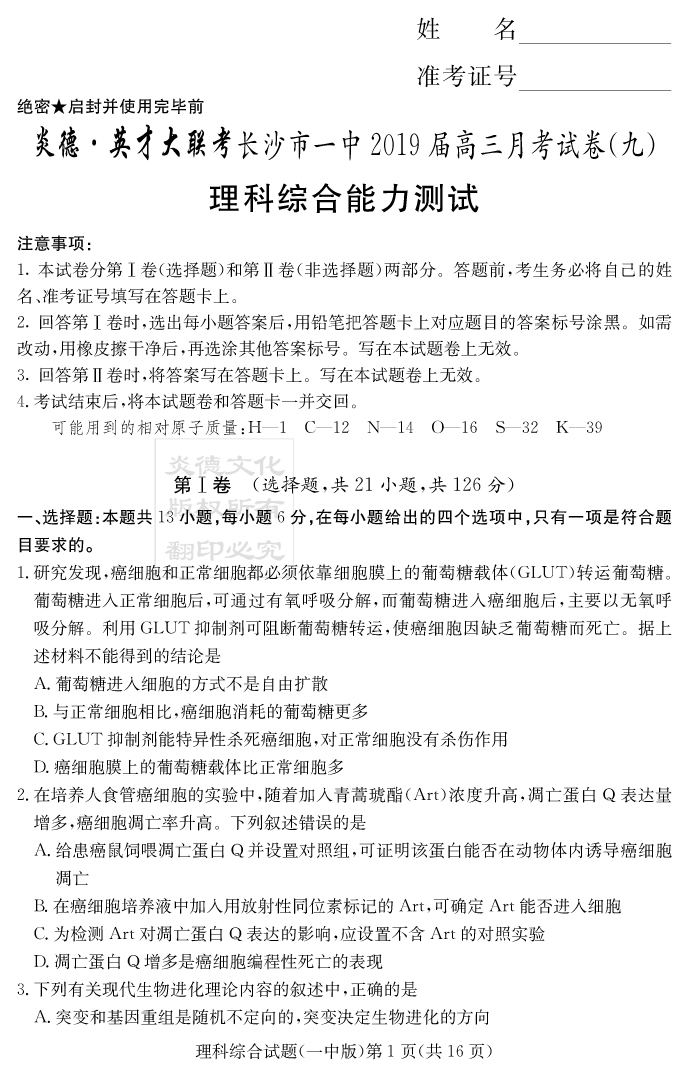 【理綜】炎德英才大聯(lián)考2019長沙一中高三9次月考