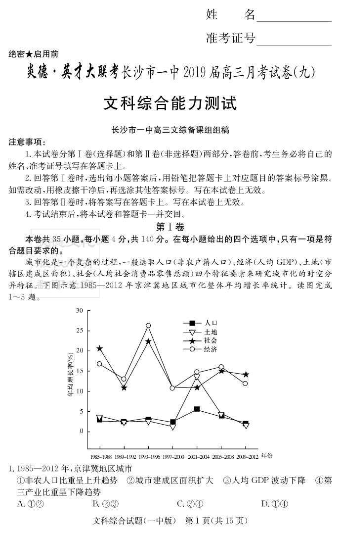 【文綜】炎德英才大聯考2019長沙一中高三9次月考