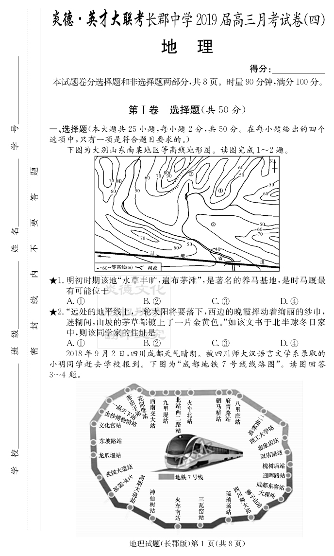 【地理】炎德英才大聯考2019長郡中學高三4次月考