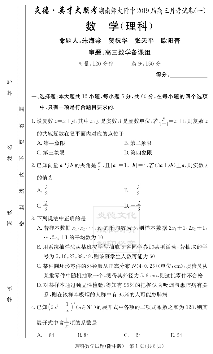 【理數(shù)】炎德英才大聯(lián)考2019師大附中高三1次月考