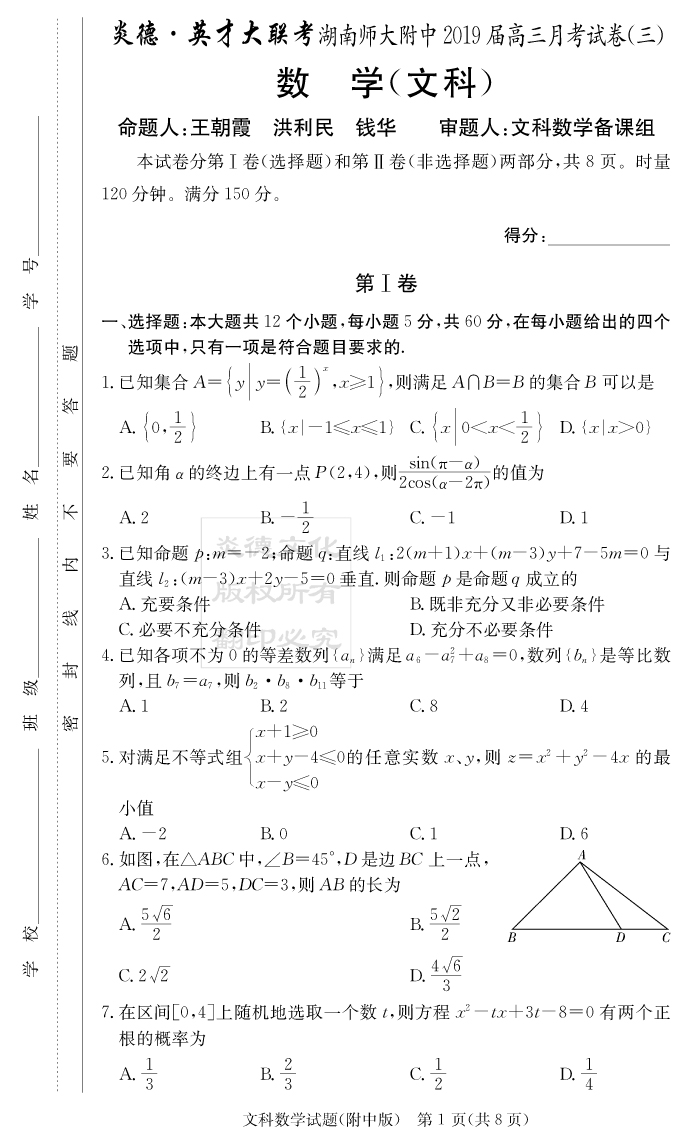 【文數】炎德英才大聯考2019師大附中高三3次月考