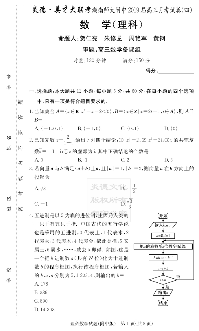 【理數】炎德英才大聯考2019師大附中高三4次月考