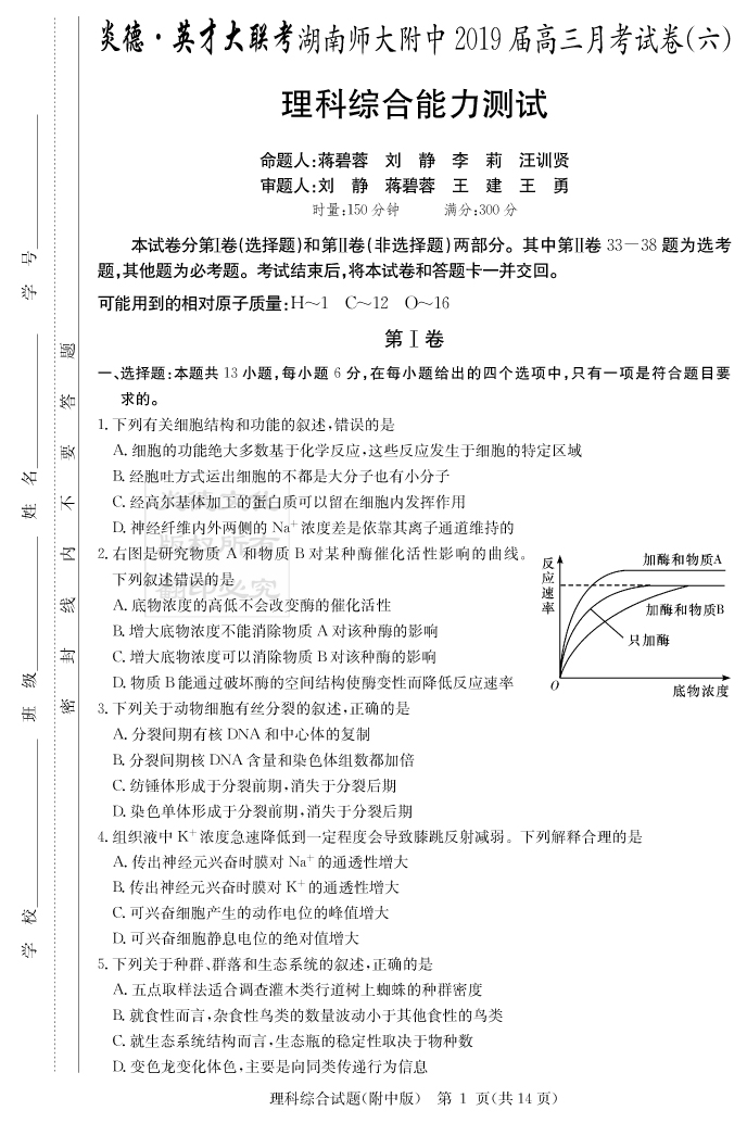 【理綜】炎德英才大聯考2019師大附中高三6次月考