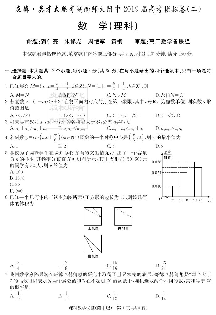 【理數】炎德英才大聯考2019師大附中高三9次月考(模擬二)