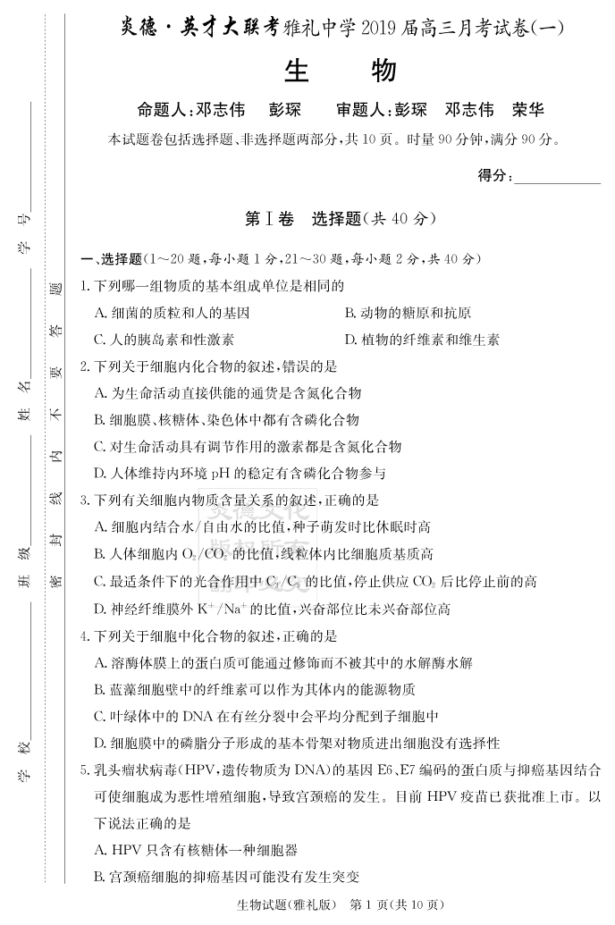 2026高考總復習單元同步滾動測試卷·生物