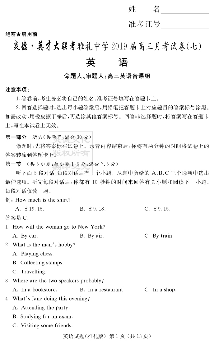 【英語】炎德英才大聯(lián)考2019雅禮中學高三7次月考
