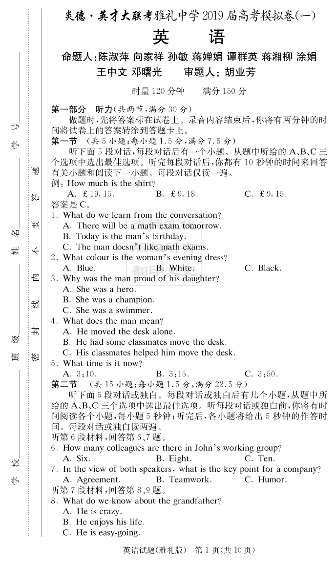 【英語】炎德英才大聯(lián)考2019雅禮中學(xué)高三9次月考(模擬一)