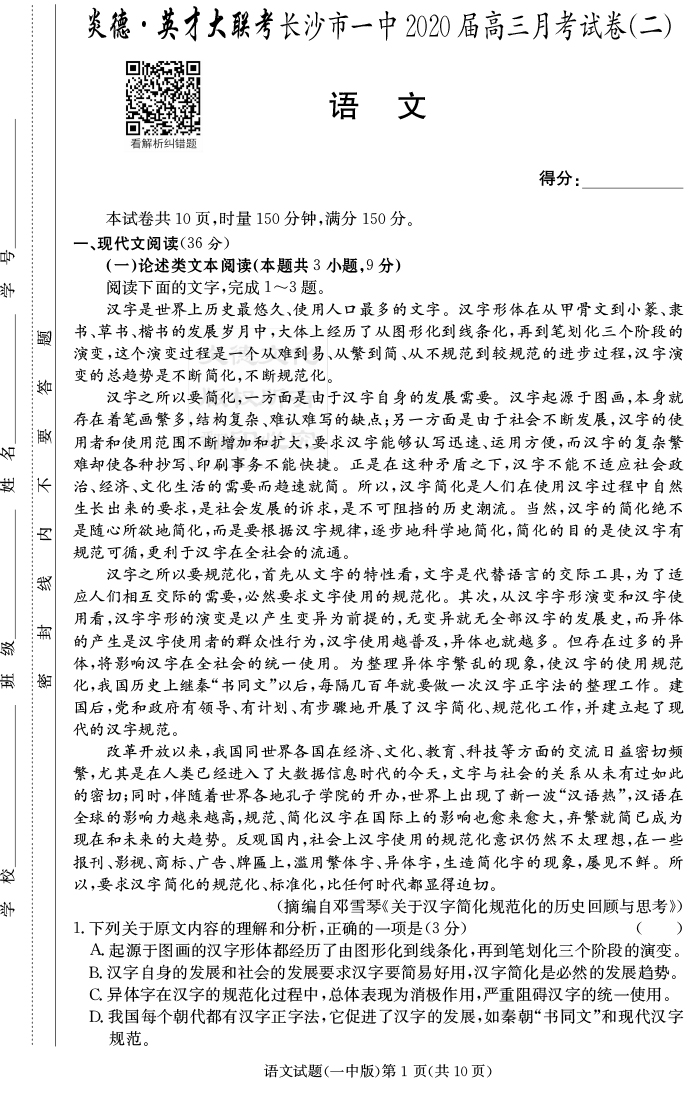 【語文】炎德英才大聯(lián)考2020屆長沙市一中高三2次月考
