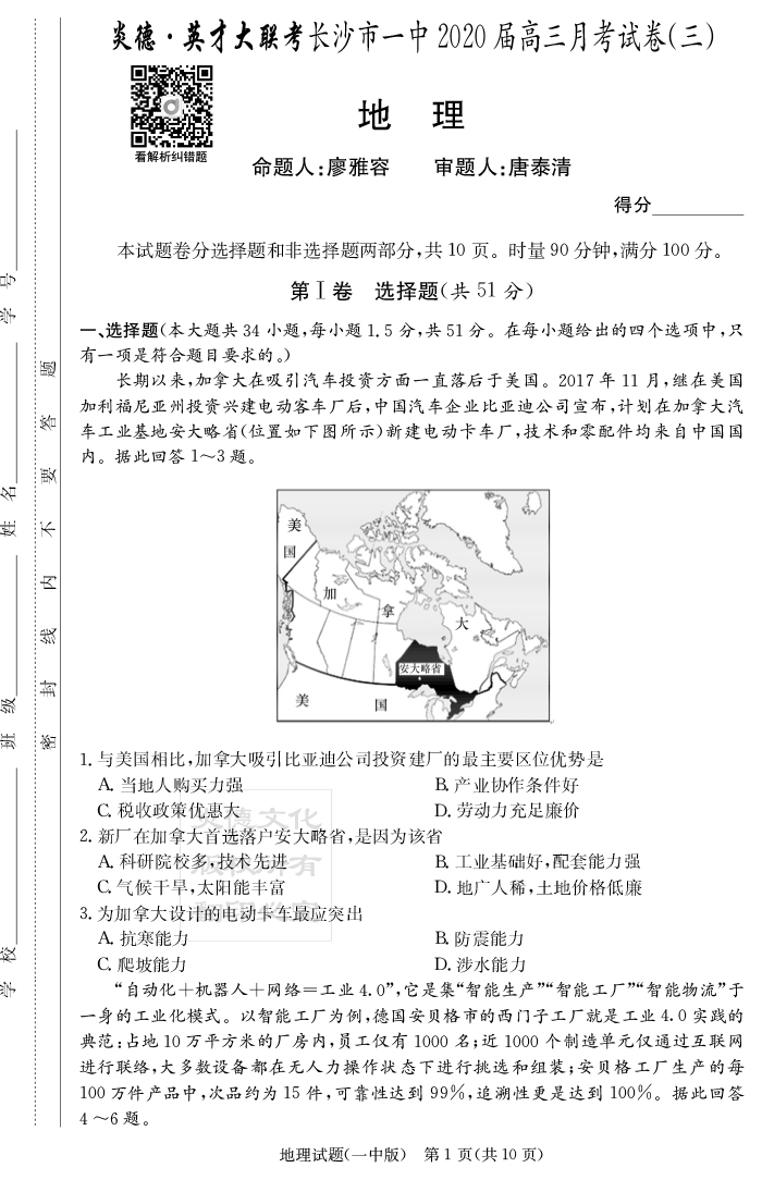 【地理】炎德英才大聯(lián)考2020屆長(zhǎng)沙市一中高三3次月考