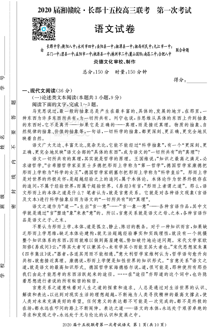 【語文】炎德英才大聯考2020屆長郡中學高三7次月考(十五校聯考一)