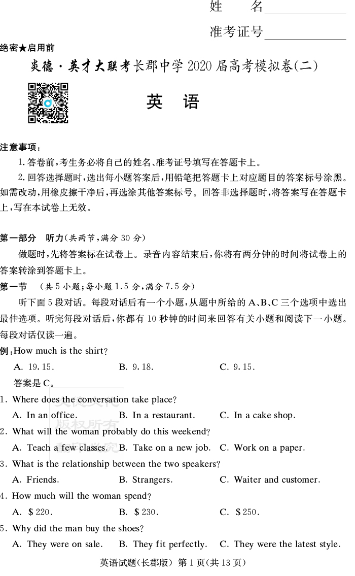 【英語】炎德英才大聯考2020屆長郡中學高三10次月考(模擬二)