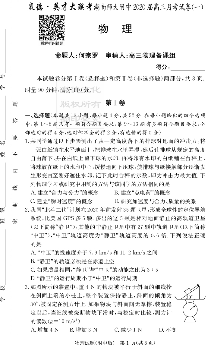 【物理】炎德英才大聯考2020屆師大附中高三1次月考
