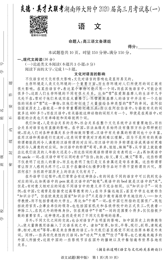 上一篇:【英語】炎德英才大聯考2020屆師大附中高三1次月考