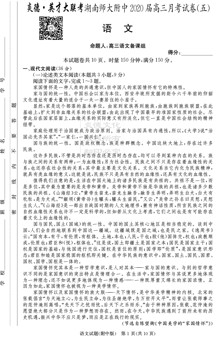 【語(yǔ)文】炎德英才大聯(lián)考2020屆師大附中高三5次月考