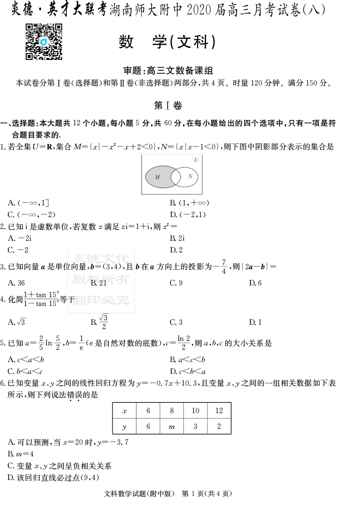 【文數】炎德英才大聯考2020屆師大附中高三8次月考