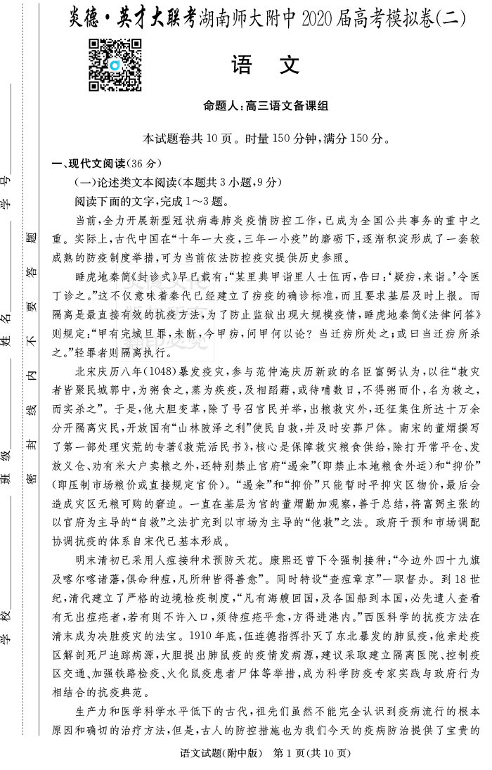 【語文】炎德英才大聯(lián)考2020屆師大附中高三9次月考(模擬二)