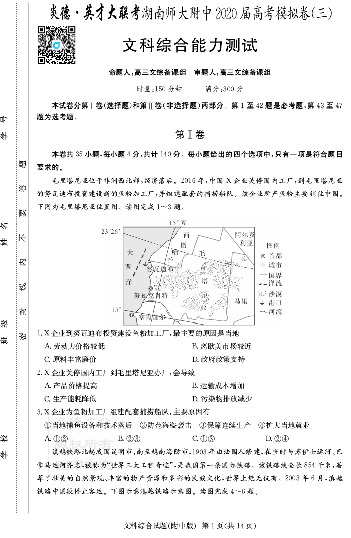 【文綜】炎德英才大聯考2020屆師大附中高三10次月考(模擬三)