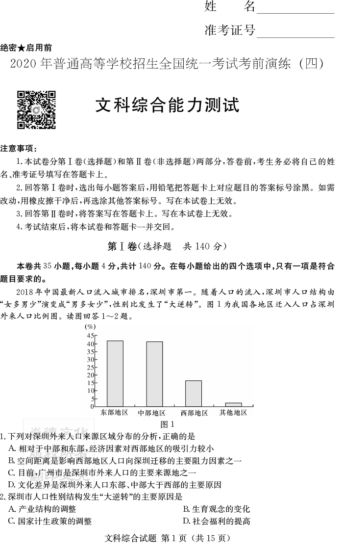 【文綜】2020年普通高等學(xué)校招生全國(guó)統(tǒng)一考試考前演練(四)