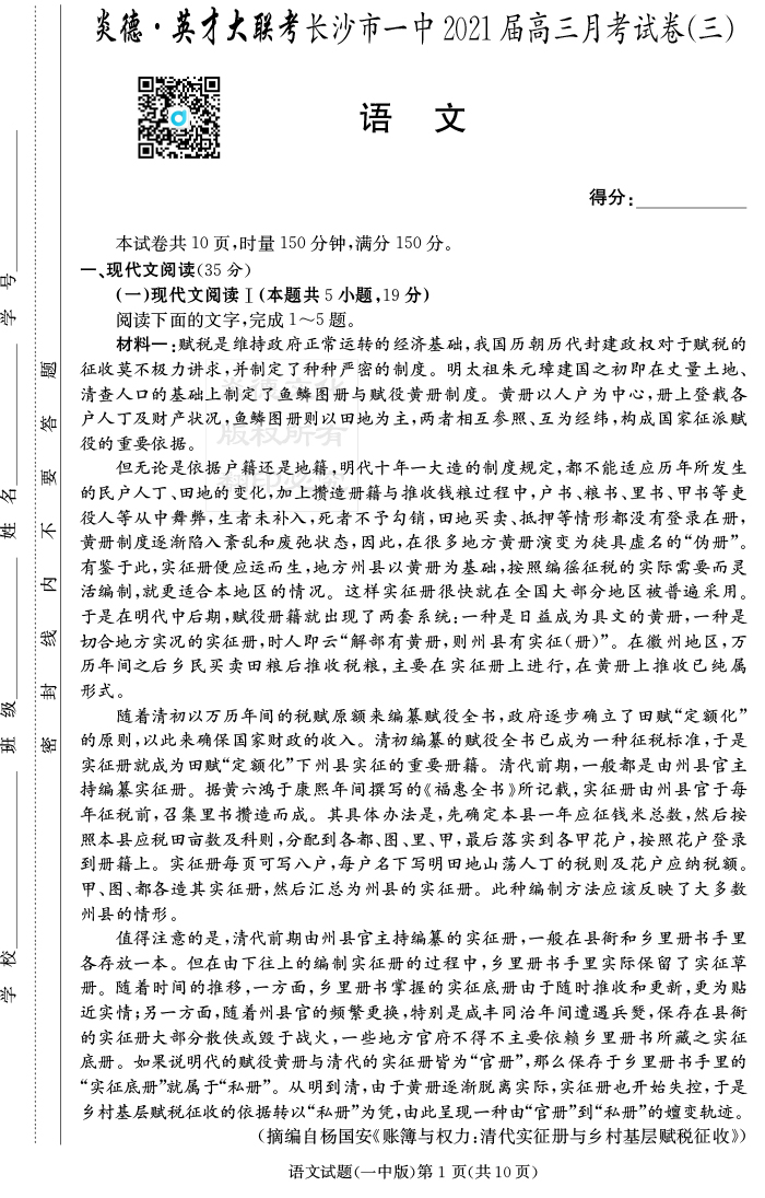【語文】炎德英才大聯考2021屆長沙市一中高三3次月考