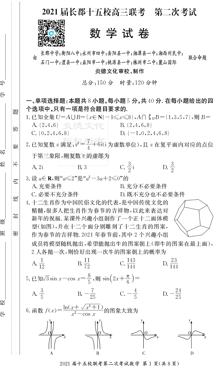 【數(shù)學(xué)】炎德英才大聯(lián)考2021屆長(zhǎng)郡中學(xué)高三8次月考(十五校聯(lián)考二)