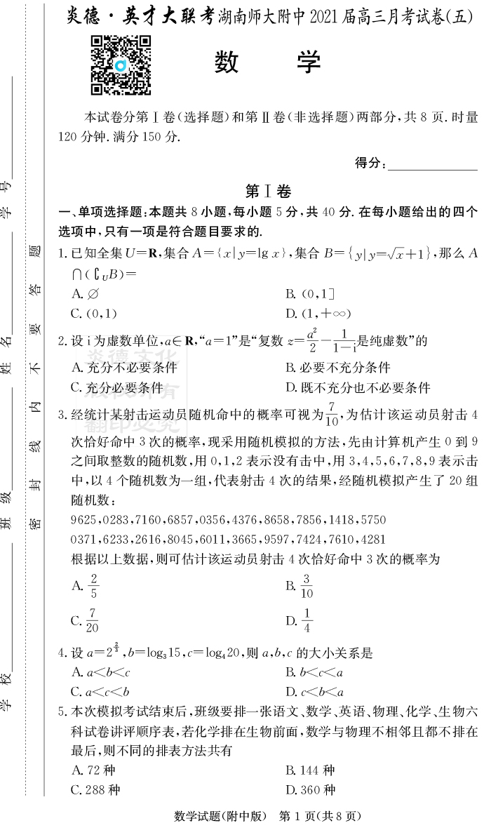 【數學】炎德英才大聯考2021屆湖南師大附中高三5次月考