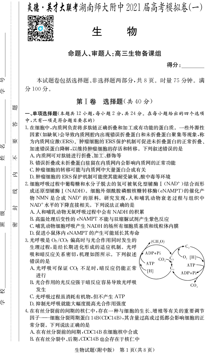 【生物】炎德英才大聯考2021屆湖南師大附中高三8次月考(模擬一)