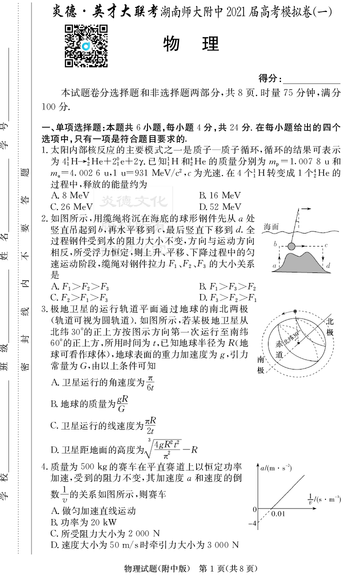 【物理】炎德英才大聯考2021屆湖南師大附中高三8次月考(模擬一)