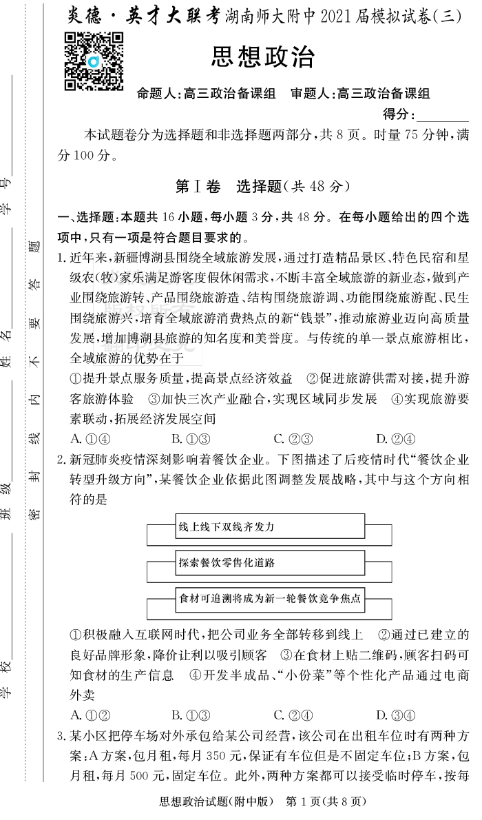 【政治】炎德英才大聯(lián)考2021屆湖南師大附中高三10次月考(模擬三)