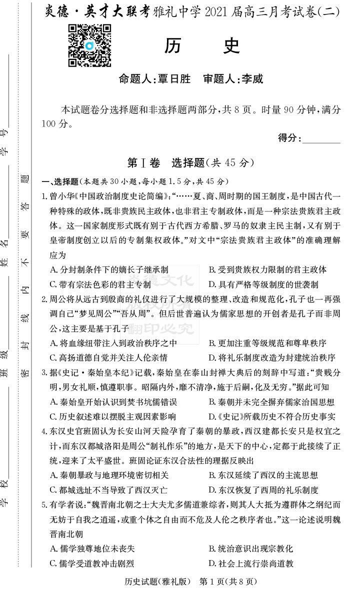 【歷史】炎德英才大聯考2021屆雅禮中學高三2次月考