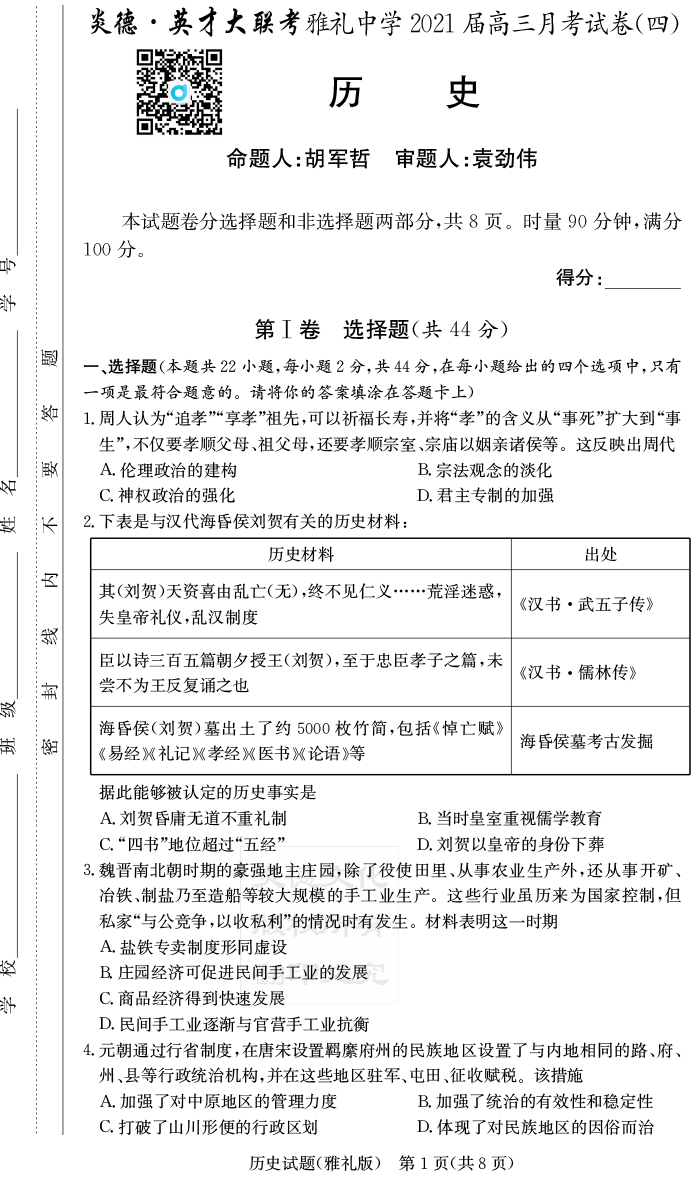 2026高考總復習單元同步滾動測試卷·歷史