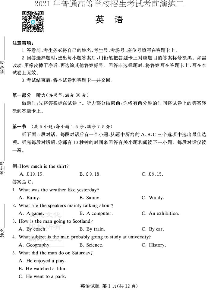 【英語】2021年普通高等學校招生全國統一考試考前演練(二)