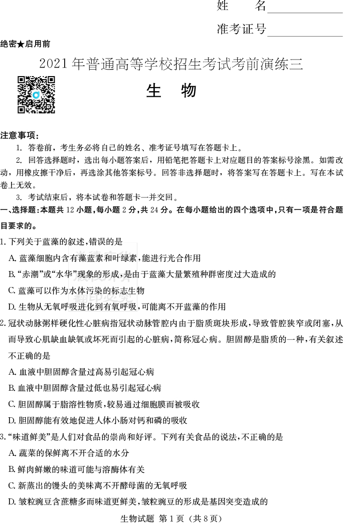 【生物】2021年普通高等學校招生全國統(tǒng)一考試考前演練(三)