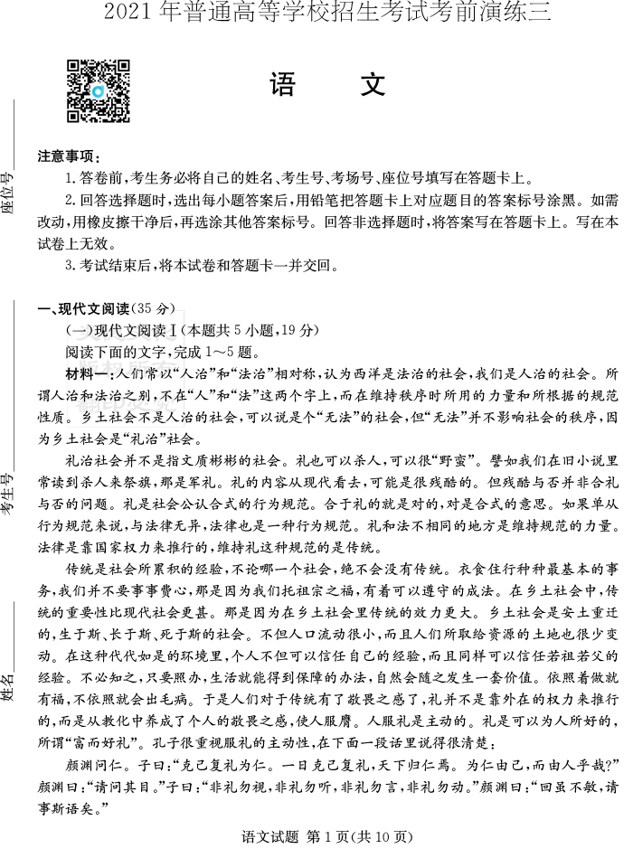 【語文】2021年普通高等學校招生全國統一考試考前演練(三)