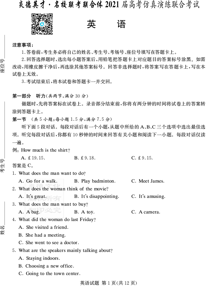 下一篇:【語文】2021年普通高等學校招生全國統一考試考前演練(五)