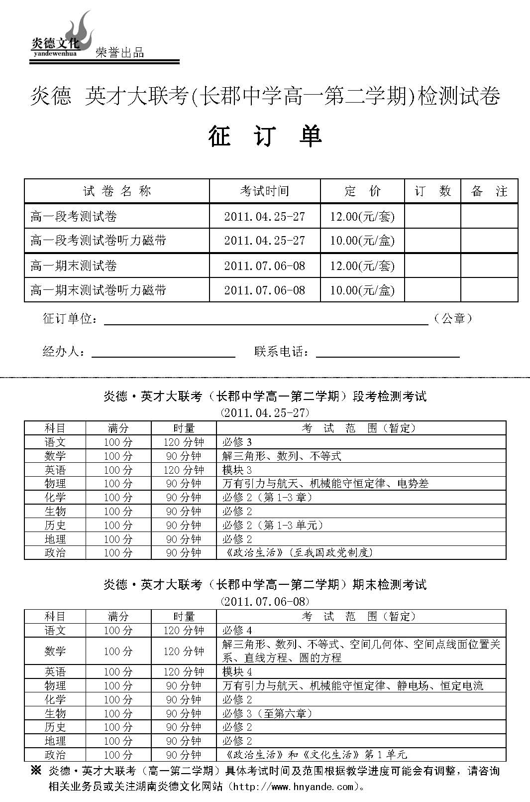 2011年春季高一二月考訂單(2011.04-2011.07)