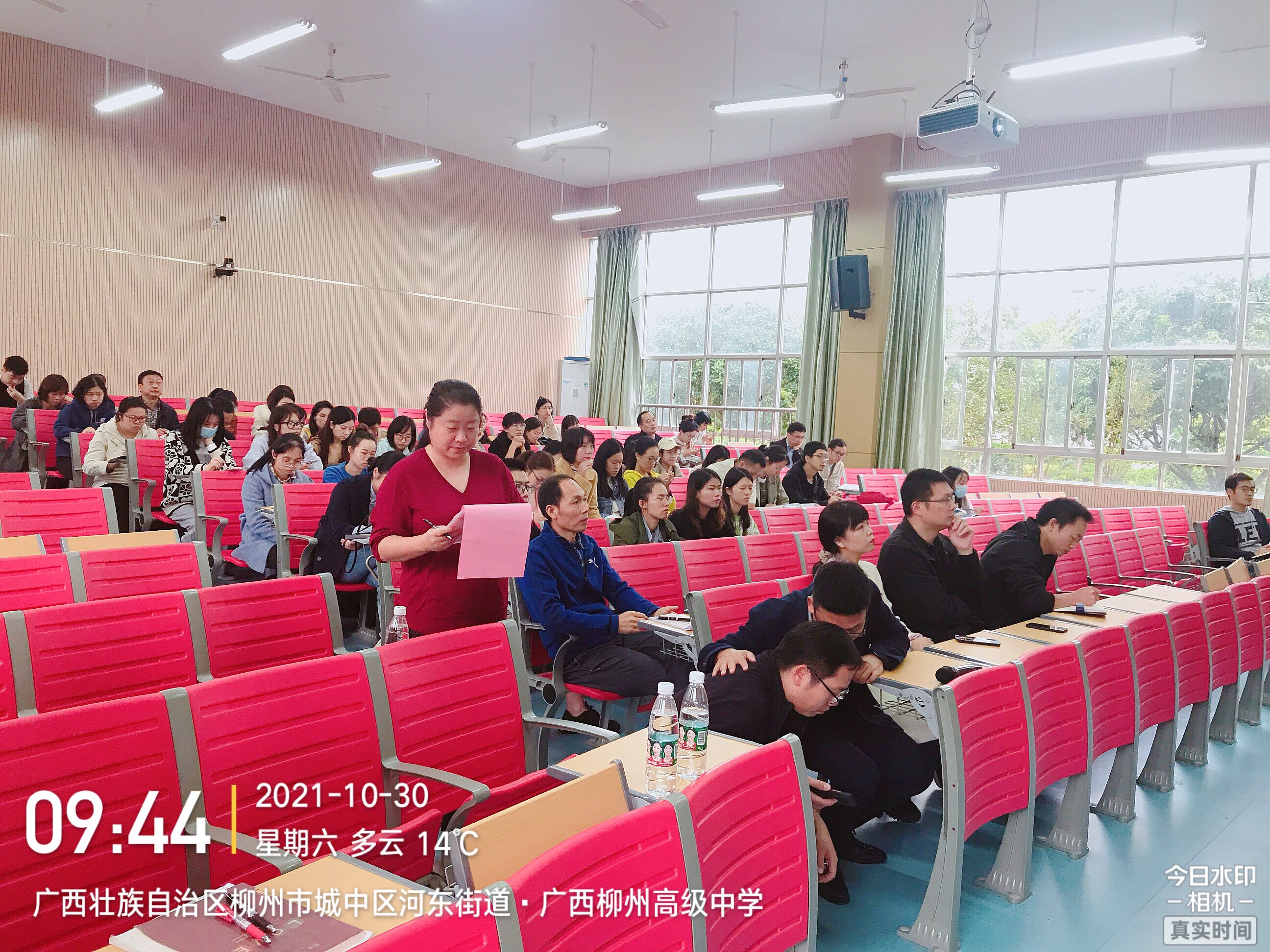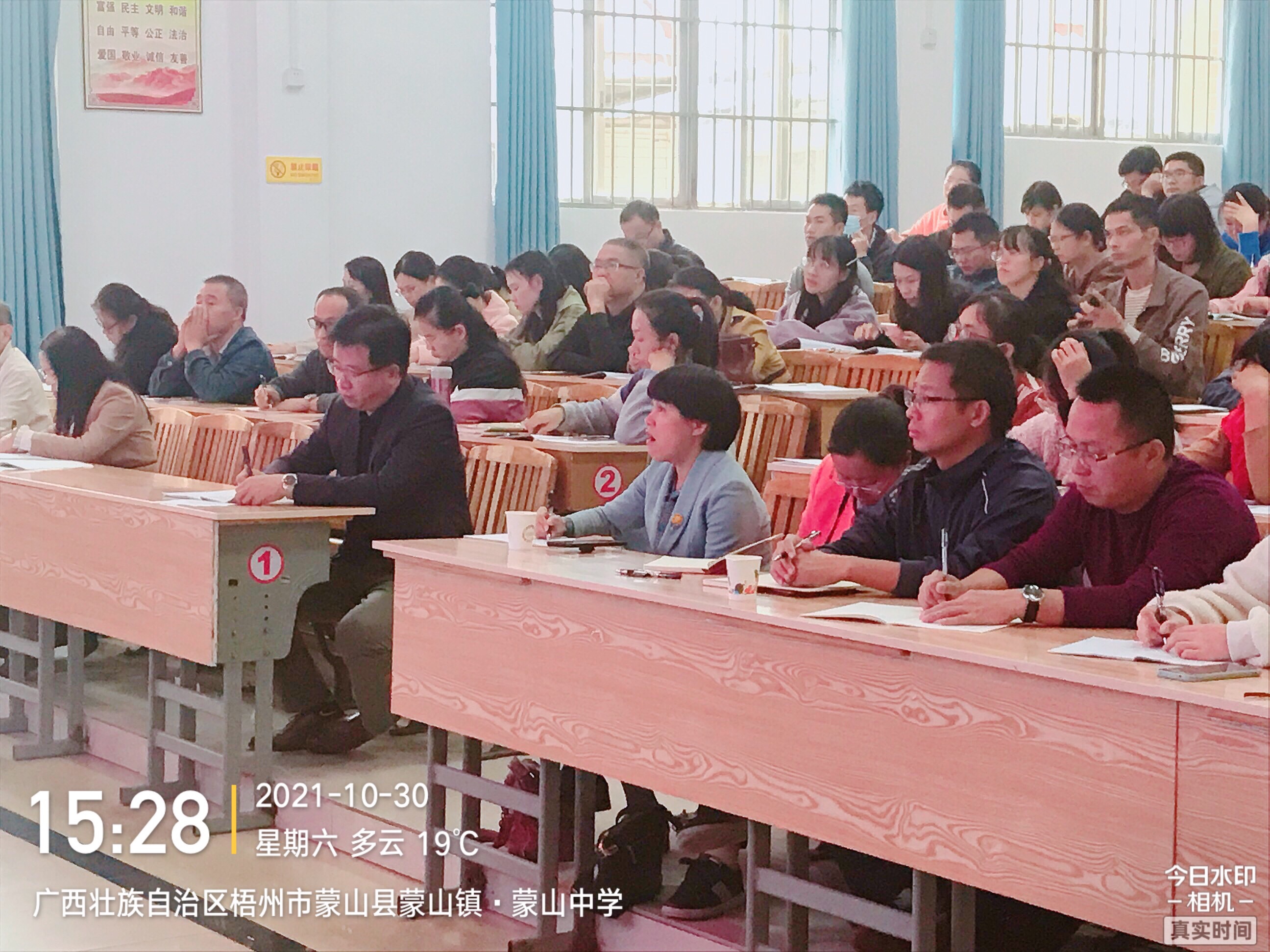 鹿寨中學全校80多名高一老師認真聽課,做筆記。