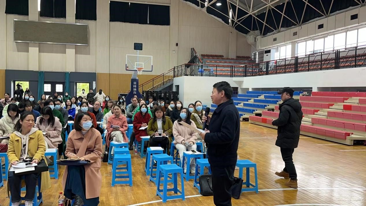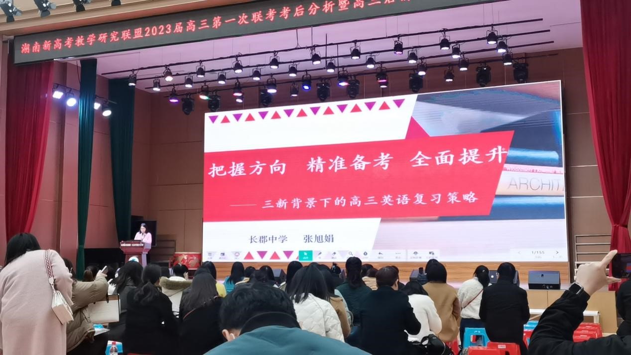 長沙市六中體育館內,郭偉、李吉英、張旭娟三位老師對英語學科進行精準講解,對2023屆高考英語命題方向作出指引。