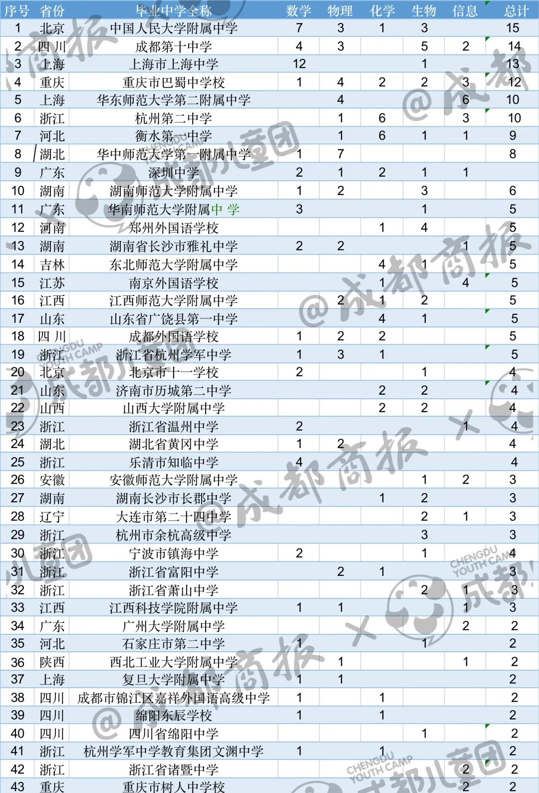 其中國集中學榜前三的競爭是比較強的,中國人民大學附屬中學以各學科總計15人位列第一,成都第七中學則僅以1人之差,以各學科總計14人位列第二,上海中學以各學科總計13人位列第三。